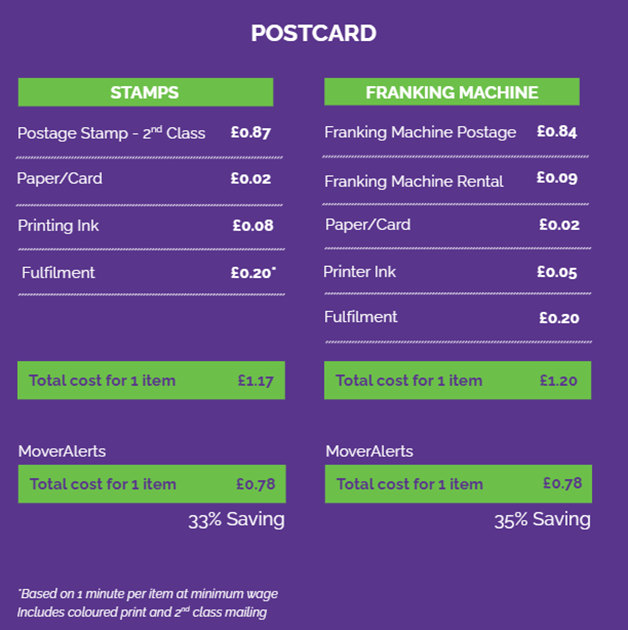 Take a look at the comparison below. When a business handles direct mail in-house, one standard postcard with print, postage and staff time costs £1.17. Outsourced to MoverAlerts? That same postcard costs 78p to send - a saving of 33%. Even with a franking machine, the saving works out at 35%!